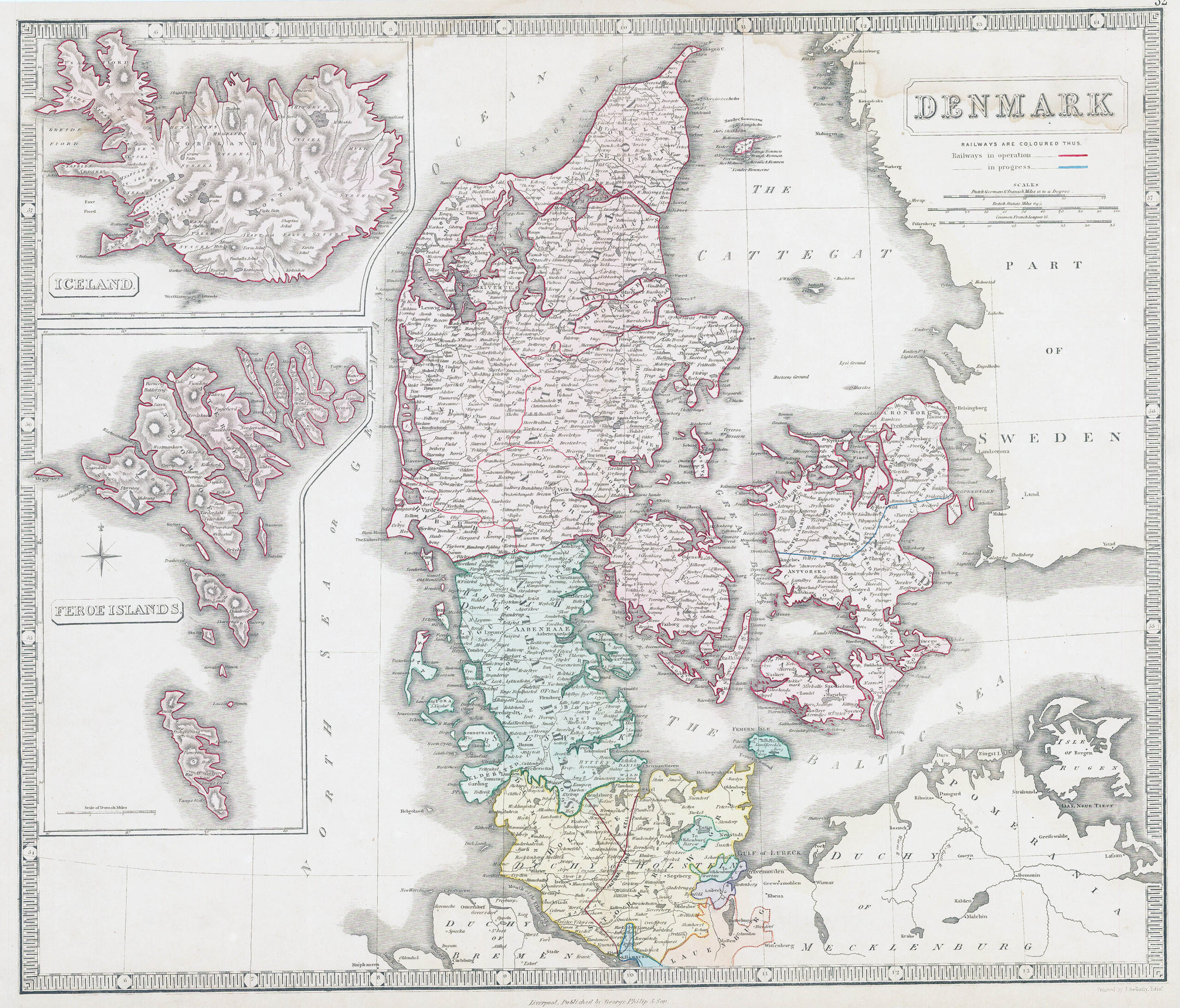 1851 "DENMARK" - A fine and detailed map of DENMARK with inset maps of FAROE ISLANDS & ICELAND with original hand colour wash.