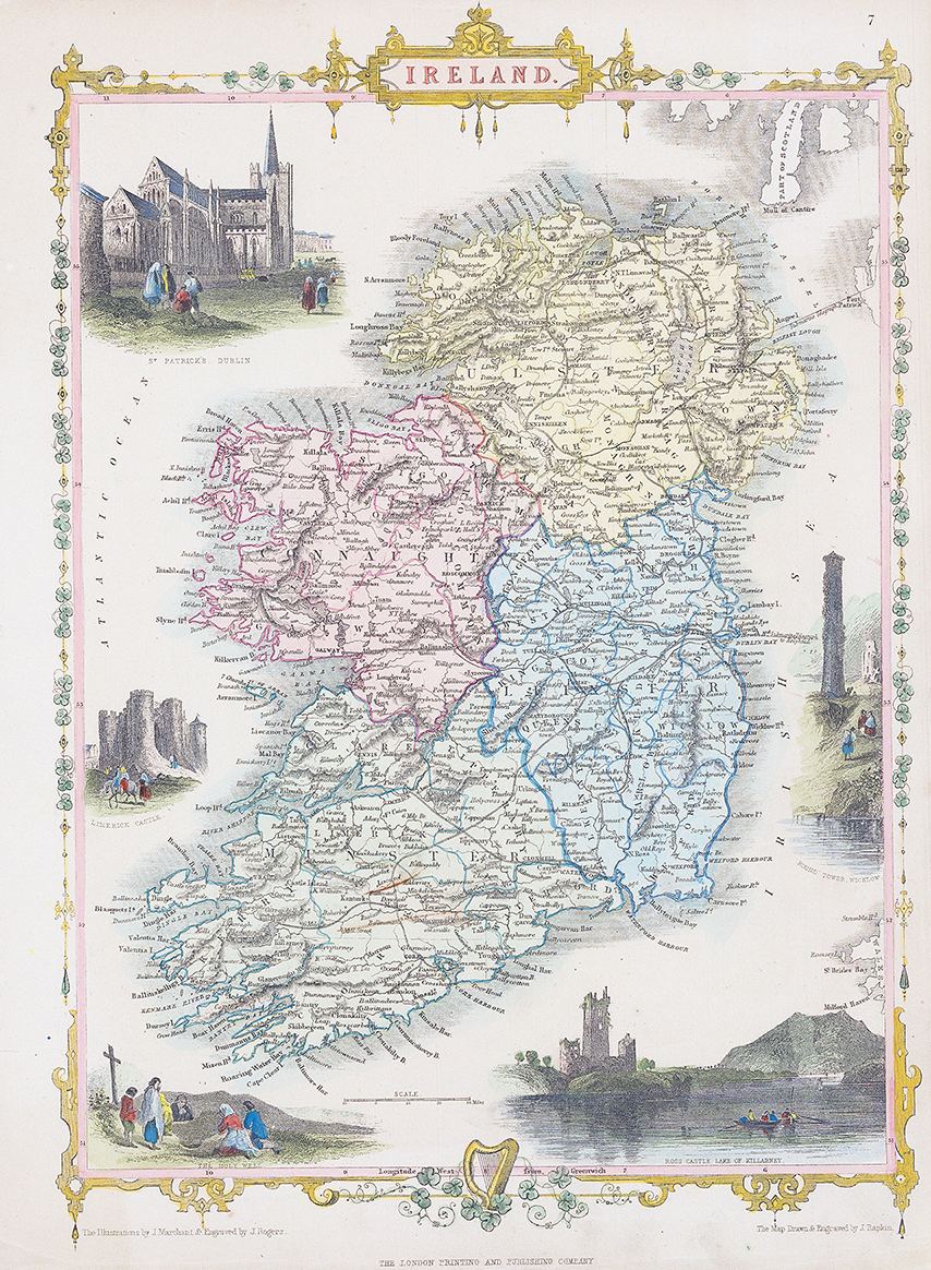 A very fine example of this decorative map by John Tallis & John Rapkin. Inset vignettes of ST PATRICKS, DUBLIN, LIMERICK CASTLE, ROUND TOWER WICKLOW, THE HOLY WELL & ROSS CASTLE LAKE OF KILLARNEY and the map divided into the 4 regions of ULSTER, CONNAUGHT, LEINSTER & MUNSTER.
