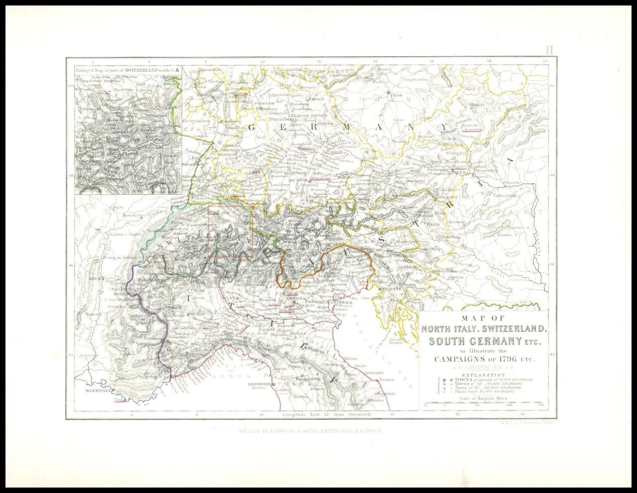 1852 - Original Antique Map titled:" MAP OF NORTH ITALY, SWITZERLAND, SOUTH GERMANY ETC, to Illustrate the CAMPAIGNS OF 1796 ETC.