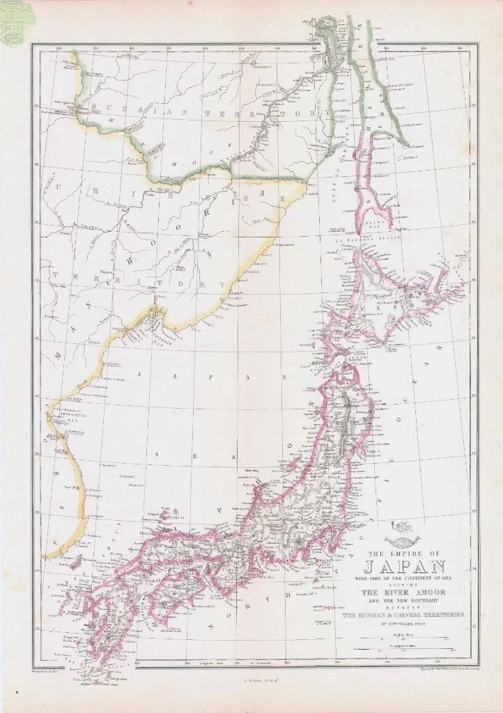 1863 - A fine large original antique map titled: "THE EMPIRE OF JAPAN WITH PART OF THE CONTINENT OF ASIA SHOWING THE RIVER AMOOR AND THE NEW BOUNDARY BETWEEN THE RUSSIAN AND CHINESE TERRITORIES"