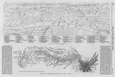 1864 March 26th - Original Antique Print taken from the Illustrated London News: ' Flood at Sheffield, Plan of Loxley Valley - View Glasgow. '
