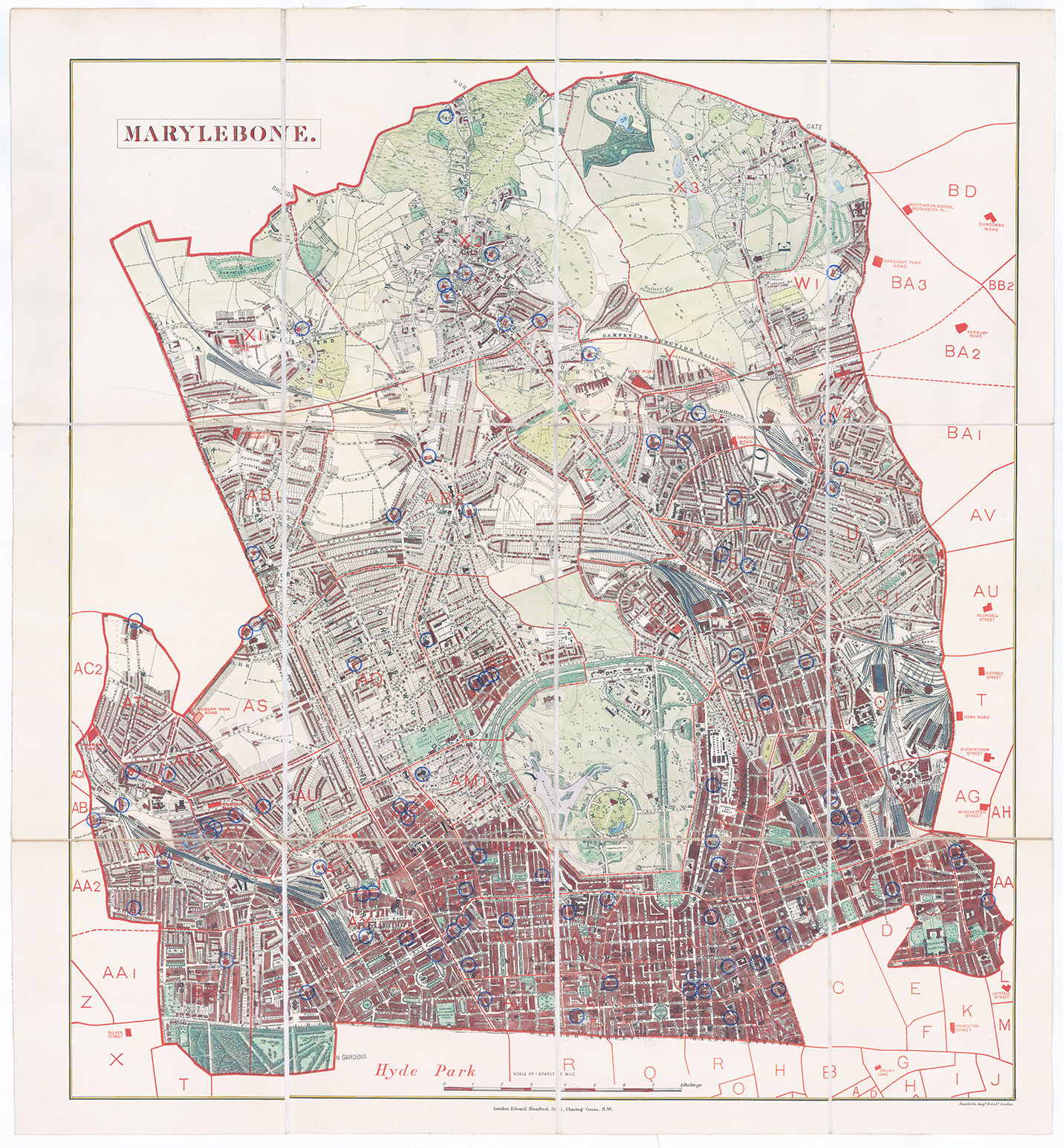 A fine and extremely scarce large scale map of the areas from HAMPSTEAD - HIGHGATE - BELSIZ PARK - KILBURN - PRIMROSE HILL - REGENTS PARK - PADDINGTON - CAMDEN. Published by Edward Stanford for THE SCHOOL BOARD MAPS OF LONDON.