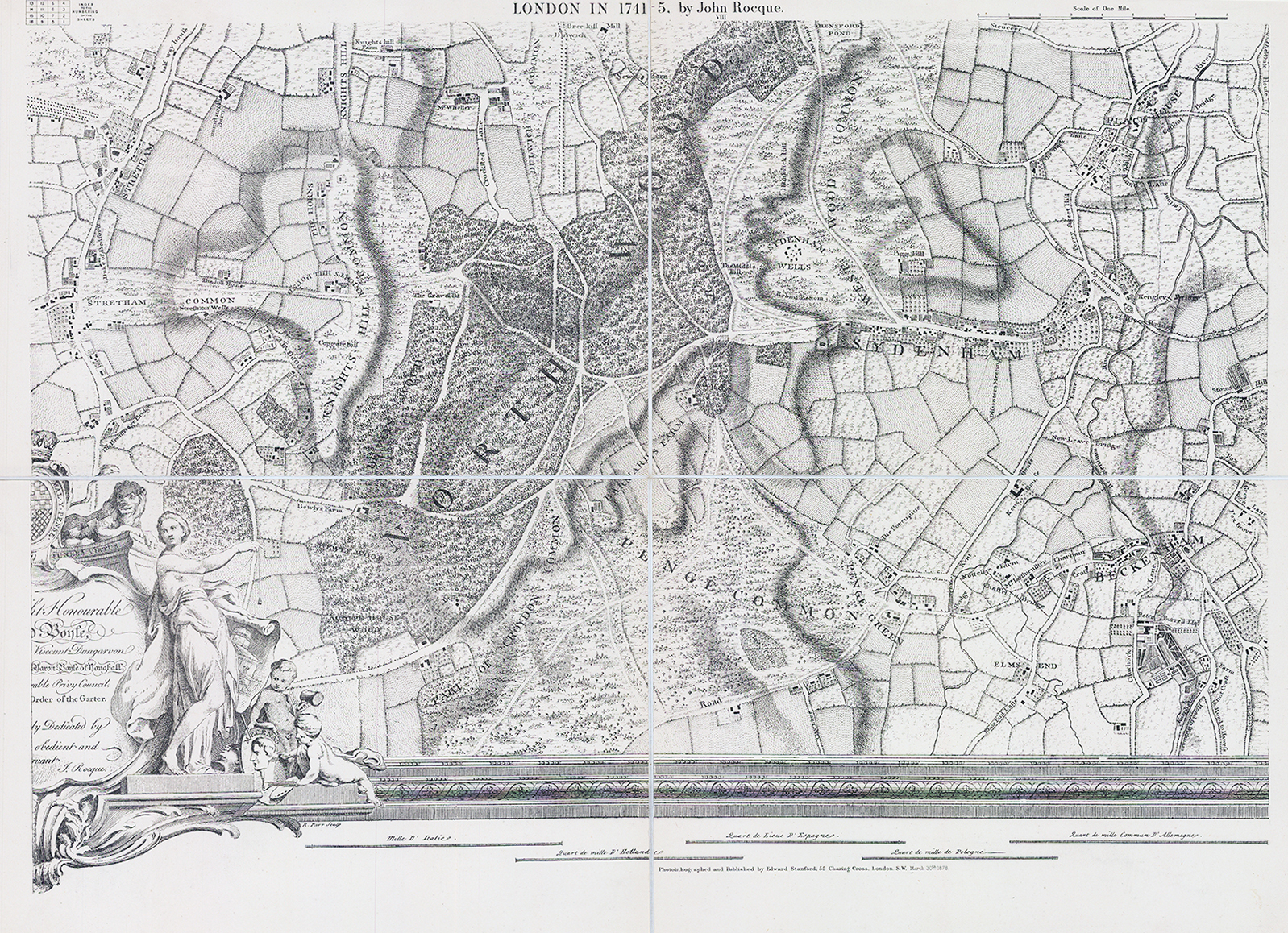 1878 Antique Map by John Rocque from his famous SURVEY OF LONDON originally published in 1741-45. This section shows the areas of STREATHAM, SYDENHAM, PENGE, BECKENHAM. This edition was published March 30th 1878 by Edward Stanford.