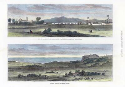 1878 - A large original antique wood engraving print titled:" Cyprus: Monastery Camp, head-quarters of Sir Garnet Wolseley and staff, Nicosia - The site of Ancient Paphos "