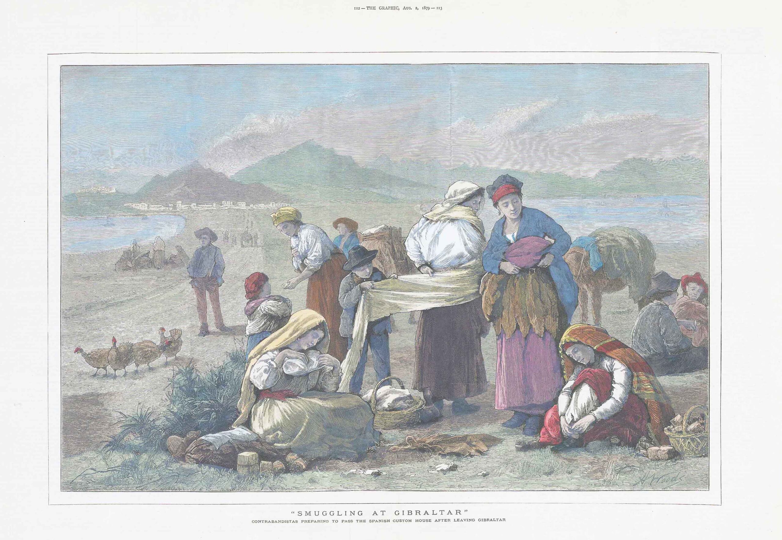 1879 - "SMUGGLING AT GIBRALTAR" CONTRABANDISTAS PREPARING TO PASS THE SPANISH CUSTOM HOUSE AFTER LEAVING GIBRALTAR" - A large original antique engraving published for 'The Graphic', a weekly illustrated newspaper.