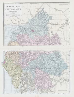 1883 - Large original colour Antique Map titled: " CUMBERLAND AND WESTMORLAND "