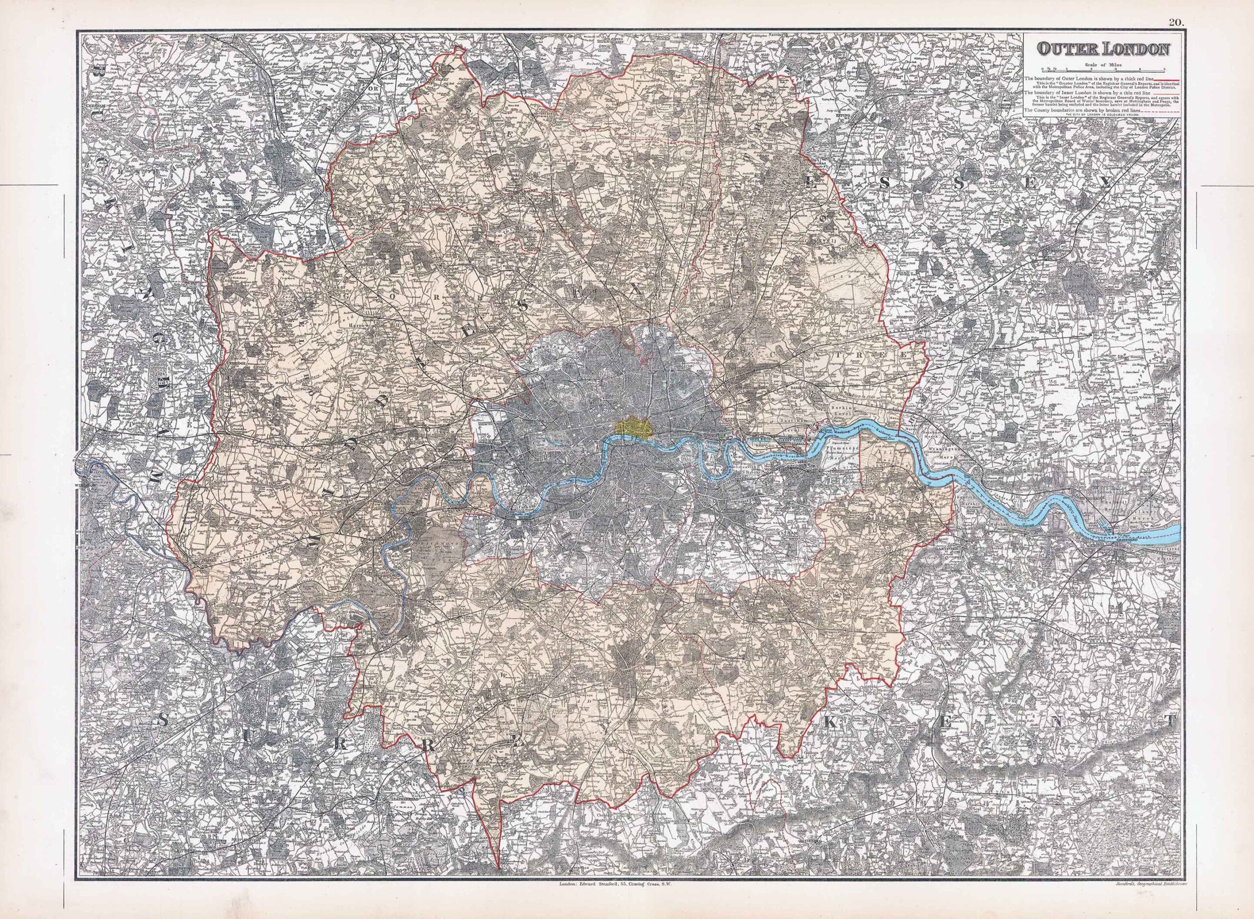 1887 - "OUTER LONDON," Very large antique lithograph map published for "STANFORD'S LONDON ATLAS OF UNIVERSAL GEOGRAPHY exhibiting the Physical and Political Divisions of the Various Countries of the World" - Folio Edition.