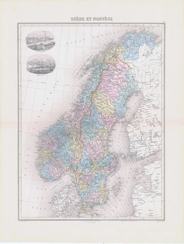 1892 - Large original colour map titled: " SUÈDE ET NORVÉGE "