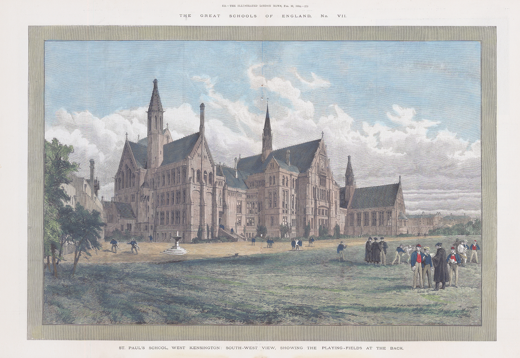 1894 "ST PAUL'S SCHOOL, WEST KENSINGTON: SOUTH-WEST VIEW, SHOWING THE PLAYING-FIELDS AT THE BACK". A fine original large antique print headed THE GREAT SCHOOLS OF ENGLAND published for The Illustrated london News February 10th, 1894.
