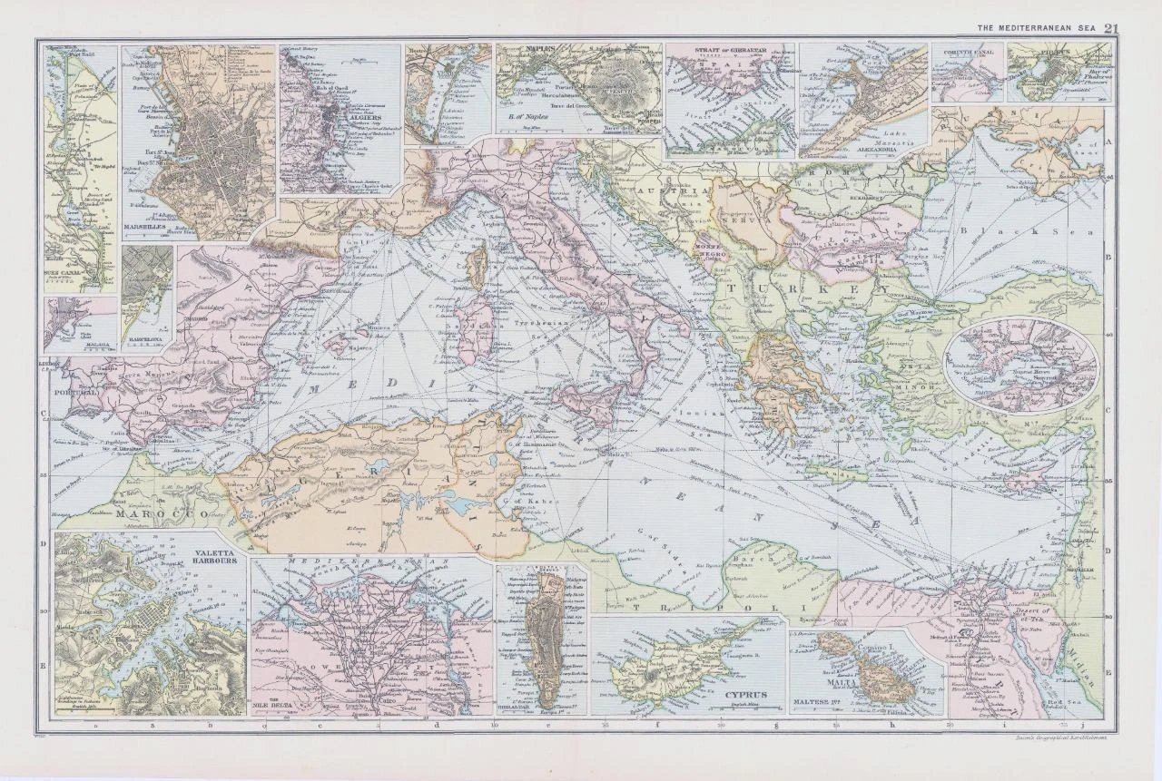1898 - Large original colour map titled: " THE MEDITERRANEAN SEA "