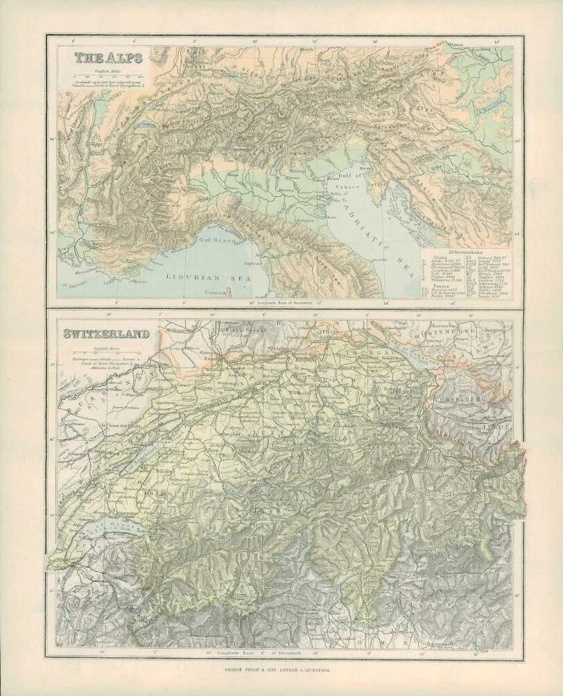 A lovely original antique Map titled: "THE ALPS - SWITZERLAND"