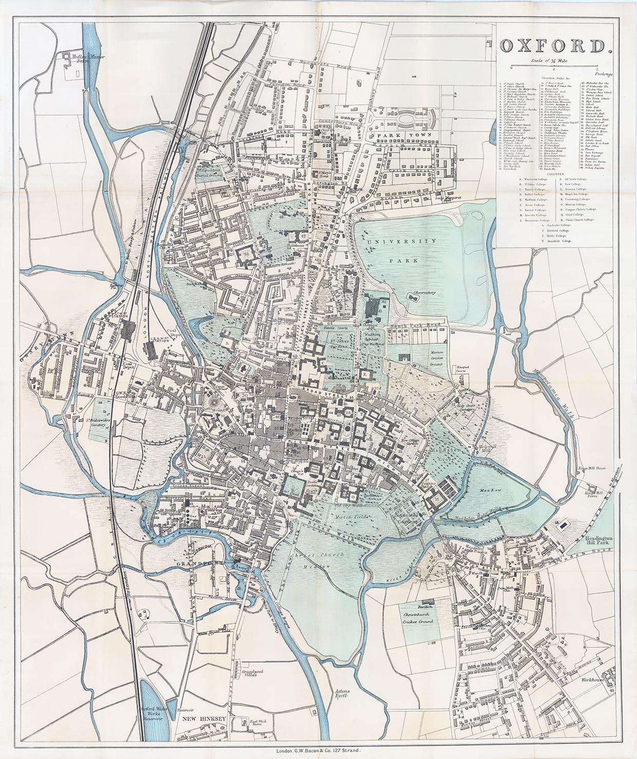 A fine original lithograph folding map of Oxford by G.W.Bacon. A highly detailed map with a table in the top right corner of CHURCHES/HALLS & COLLEGES.