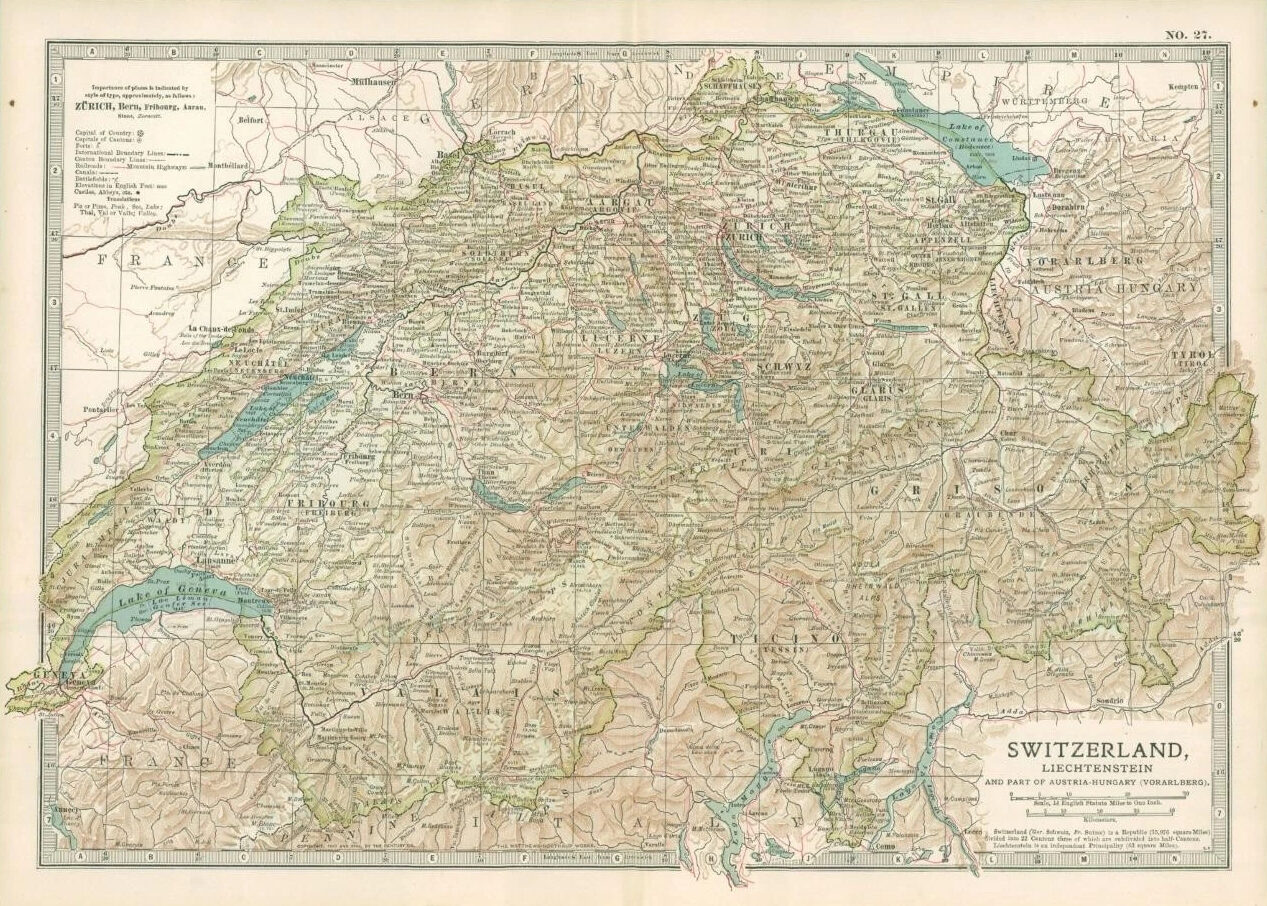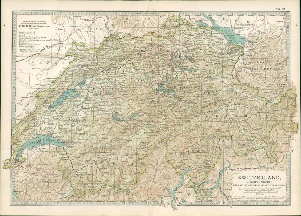 1903 - An original Antique colour Map titled: 'SWITZERLAND LIECHTENSTEIN AND PART OF AUSTRIA-HUNGARY (Vorarlberg)'