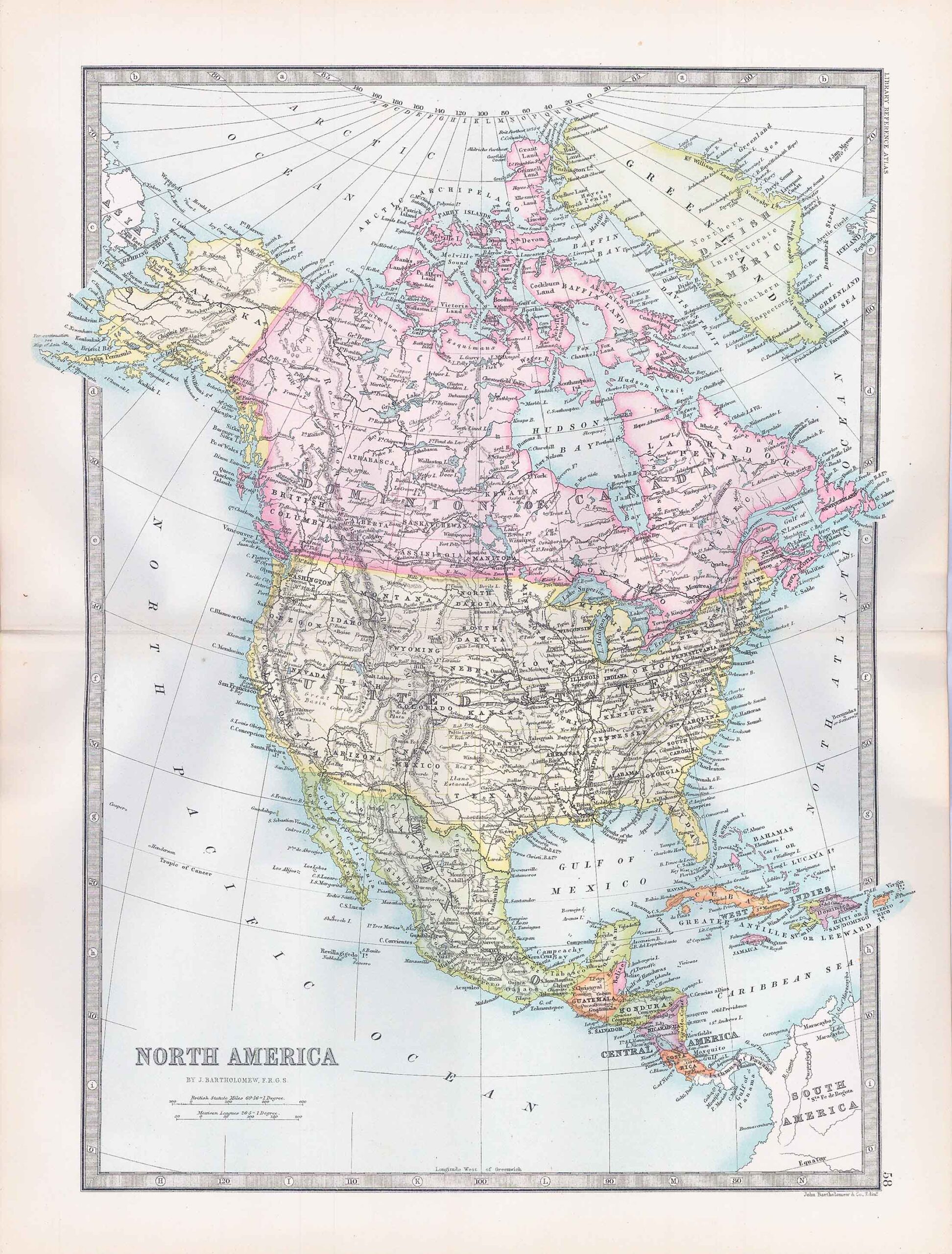 1912 Antique Map NORTH AMERICA Greenland Gulf Mexico Asia (BWM4-57)