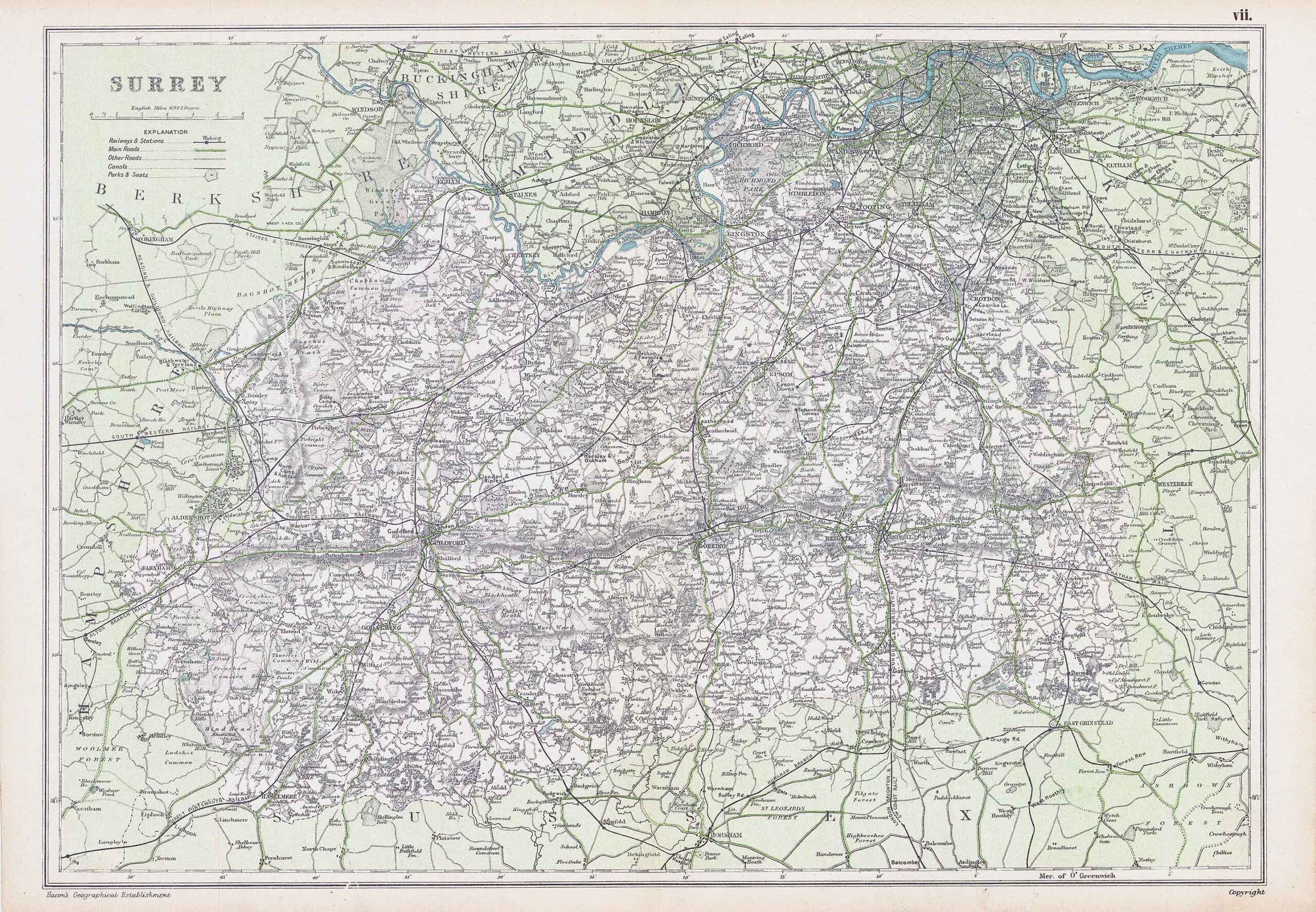 1912 - "SURREY" Original colour antique map edited by William Stanford and published by G W Bacon, London for "BACON'S LARGE SCALE ATLAS of LONDON and SUBURBS".