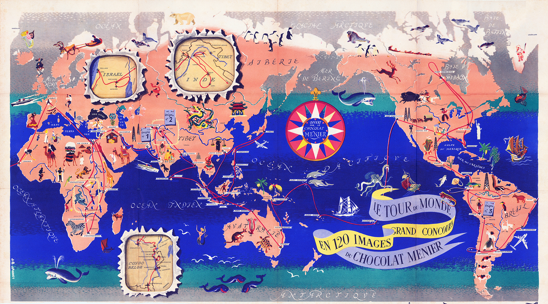 Chocolat Menier had long been using posters as advertisements when this pictorial map was published in 1956. The company was founded in 1816 as a pharmaceutical manufacturer in Paris which manufactured chocolate as a medicinal product. The first posters were published in 1893 featuring a young girl using a piece of chocolate to write the name Chocolat Menier on a wall or window. The posters were an immediate success and the image of the girl would soon be featured on Menier’s packed products as well as on promotional items such as tin ware, creamers, bowls, canister sets and even children’s exercise books.The company’s presence quickly increased in the international market, and in 1893 Chocolat Menier exhibited at the World’s Fair in Chicago where they were billed as the leading chocolate makers in the world. The company continued to prosper till WWI, when the neutral countries of Switzerland and the US were able to forge ahead in the market, untouched by the ravages of war. Despite this Chocolat Menier continued production but suffered setbacks again as WWII swept the continent.