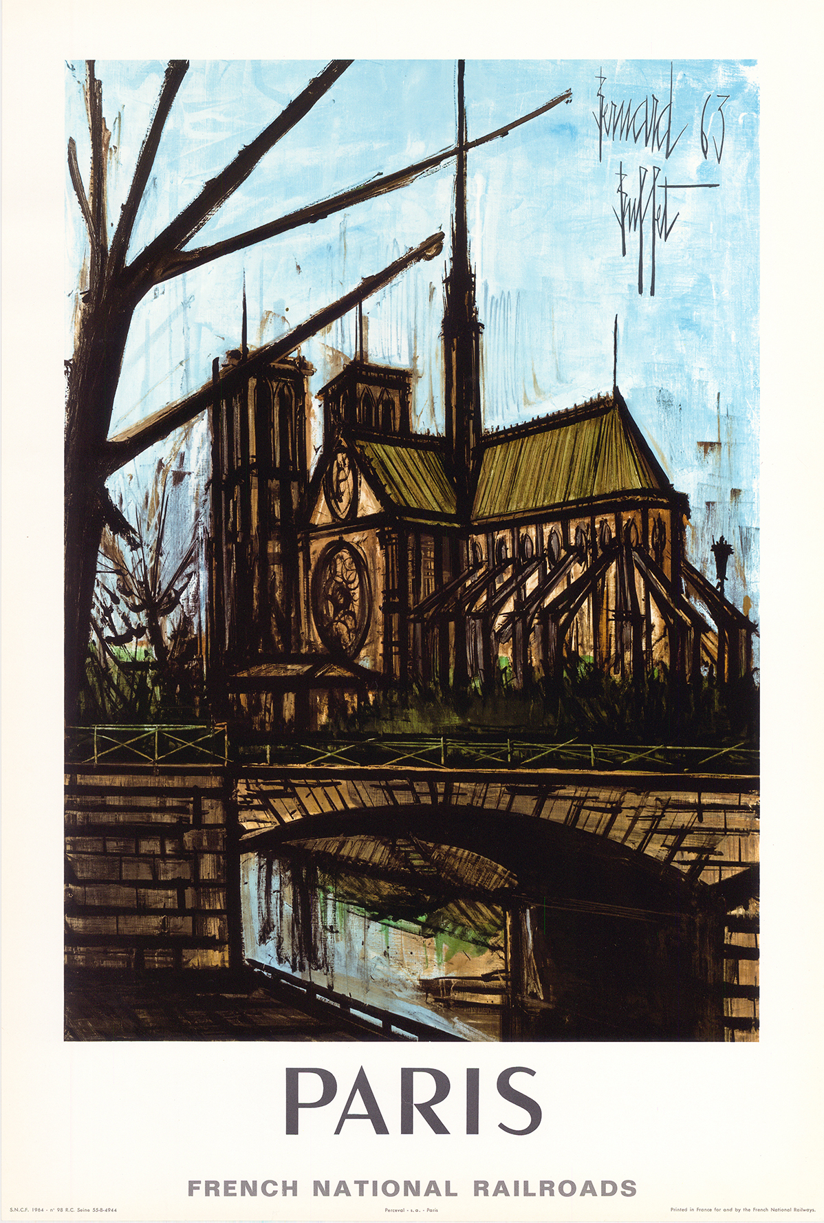 An original vintage travel poster for the SNCF French Railways promoting Paris *Notre Dame”. The original artwork is by Bernard Buffet. Overall size approx. 60cm x 40cm. This poster was first published in 1965 with French German text and then published with this English text in 1967.