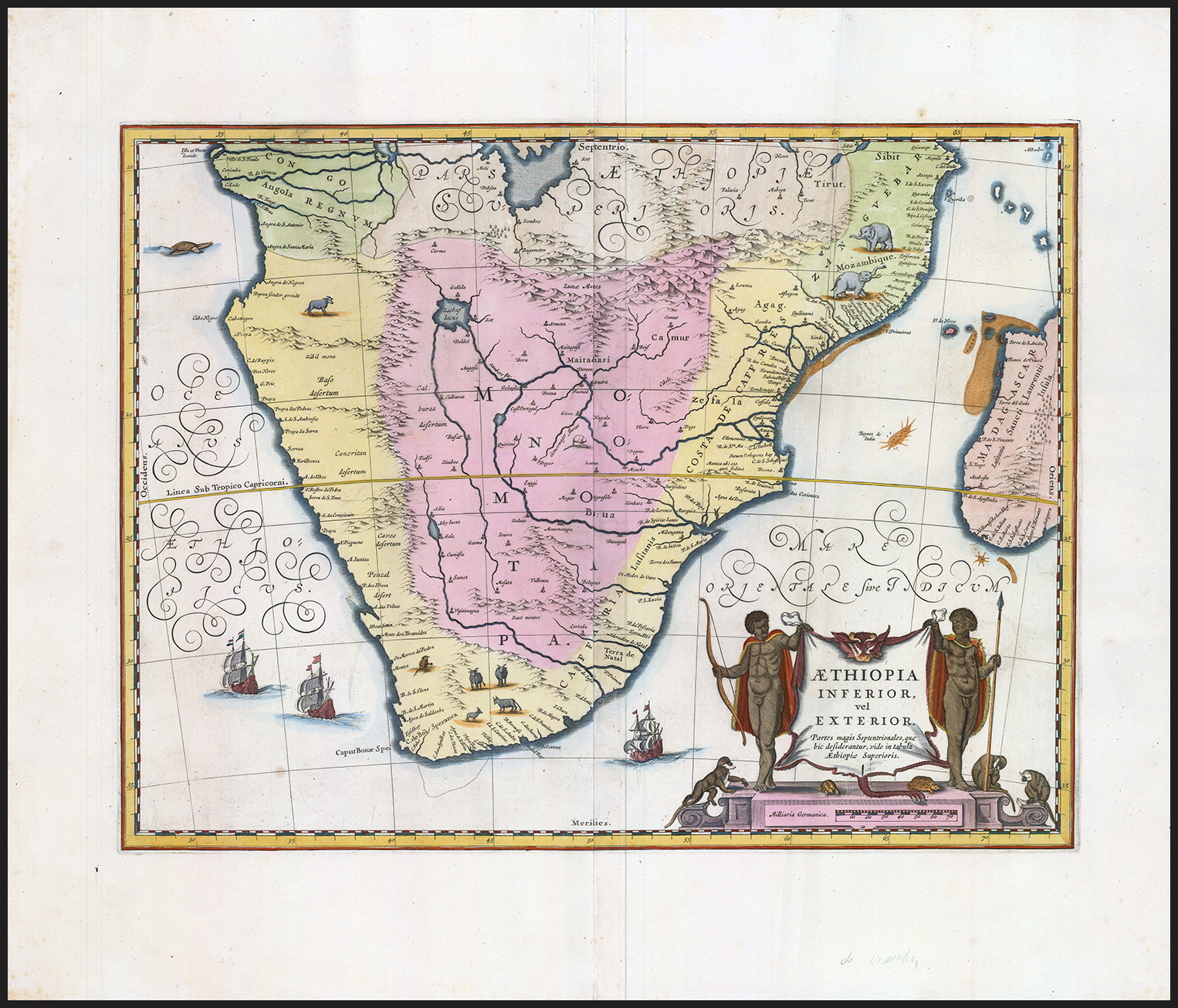 Attractive map of Southern Africa, shortly before the first Dutch settlement in the region, by Jan Jansson. The area shown is from the Congo River basin around the Cape of Good Hope and up the east coast as far as northern present-day Mozambique. Many coastal names shown, including Mozambique Island, which was an important stop over for ships sailing to India and points east. To the north, one of the Ptolemaic lakes thought to be the source of the Nile is shown. Information on the interior is sparse, reflecting the lack of knowledge the Europeans had about the interior of Africa. This map can be distinguished from Blaeu's map of the same title by lack of the sailing ship to the west of Madagascar along the equator, which is present on the Blaeu.