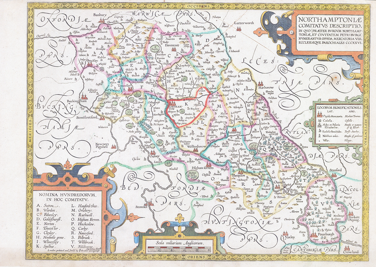 A rare and decorative 17th century map of Northamptonshire which was originally produced for William Smith* in c.1602 / 1603 (engraver: Jodocus Hondius) and then published later by John and Henry Overton in one of their composite atlases from c.1670 to c.1755. Pre-dating both the Saxton / Kip (1607) and the John Speed (1611-12), this is the earliest printed / detailed map dedicated solely to the county of Northamptonshire.