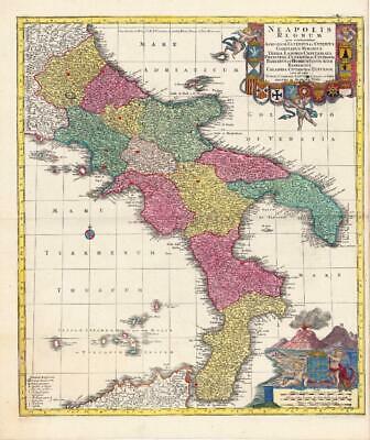 Finely engraved map of the Kingdom of Naples.The region is depicted extending from Aprutium to Calabria and including part of Sicily. Includes a decorative cartouche with 12 coats of arms of the various Kingdoms, a large coat of arms for the Insignia of Naples and vignette of Mt. Vesuvius
