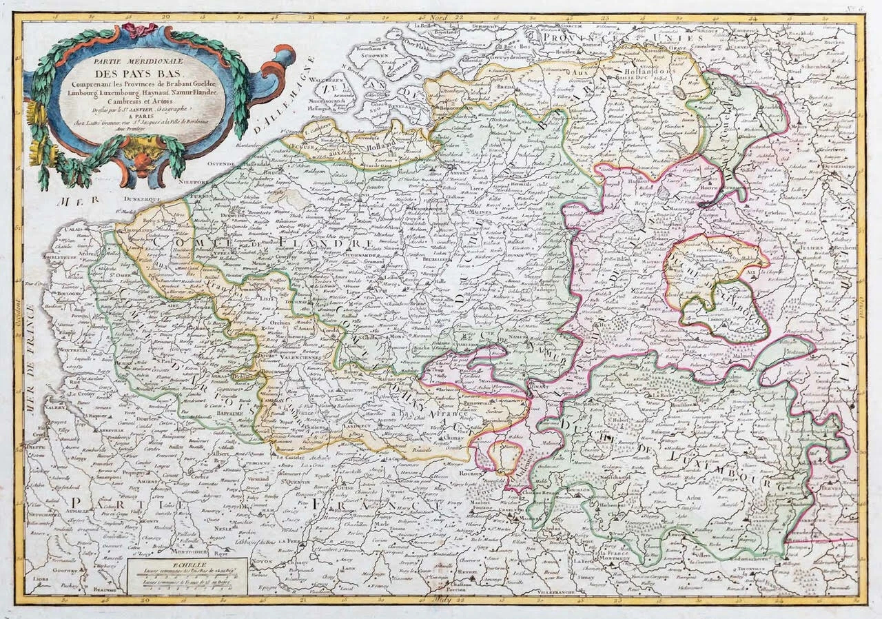 A highly detailed and decorative large map of Belgium and Luxembourg. The map depicts the departments of Champagne and Brie from Picardie to Franche Compte and from Ile-de-France to the Duchy of muxembourg. Historically the province of Champagne was bounded on the north by the bishopric of Liege and by Luxembourg, on the east by Lorraine, on the south by Burgendy and on the west by Ile-de-France and by Picardy.