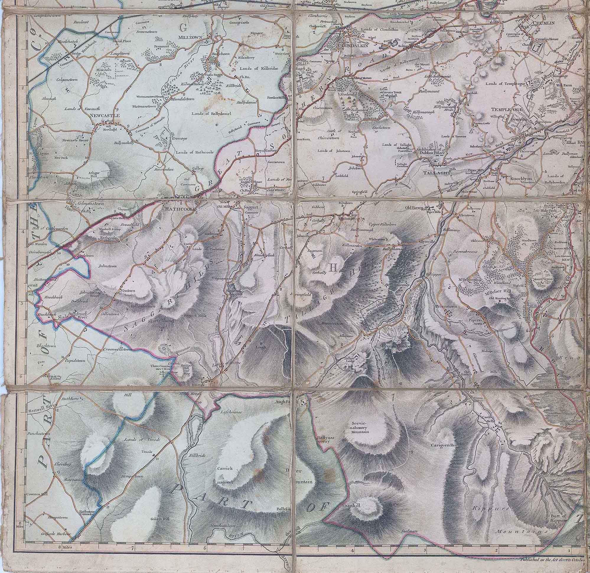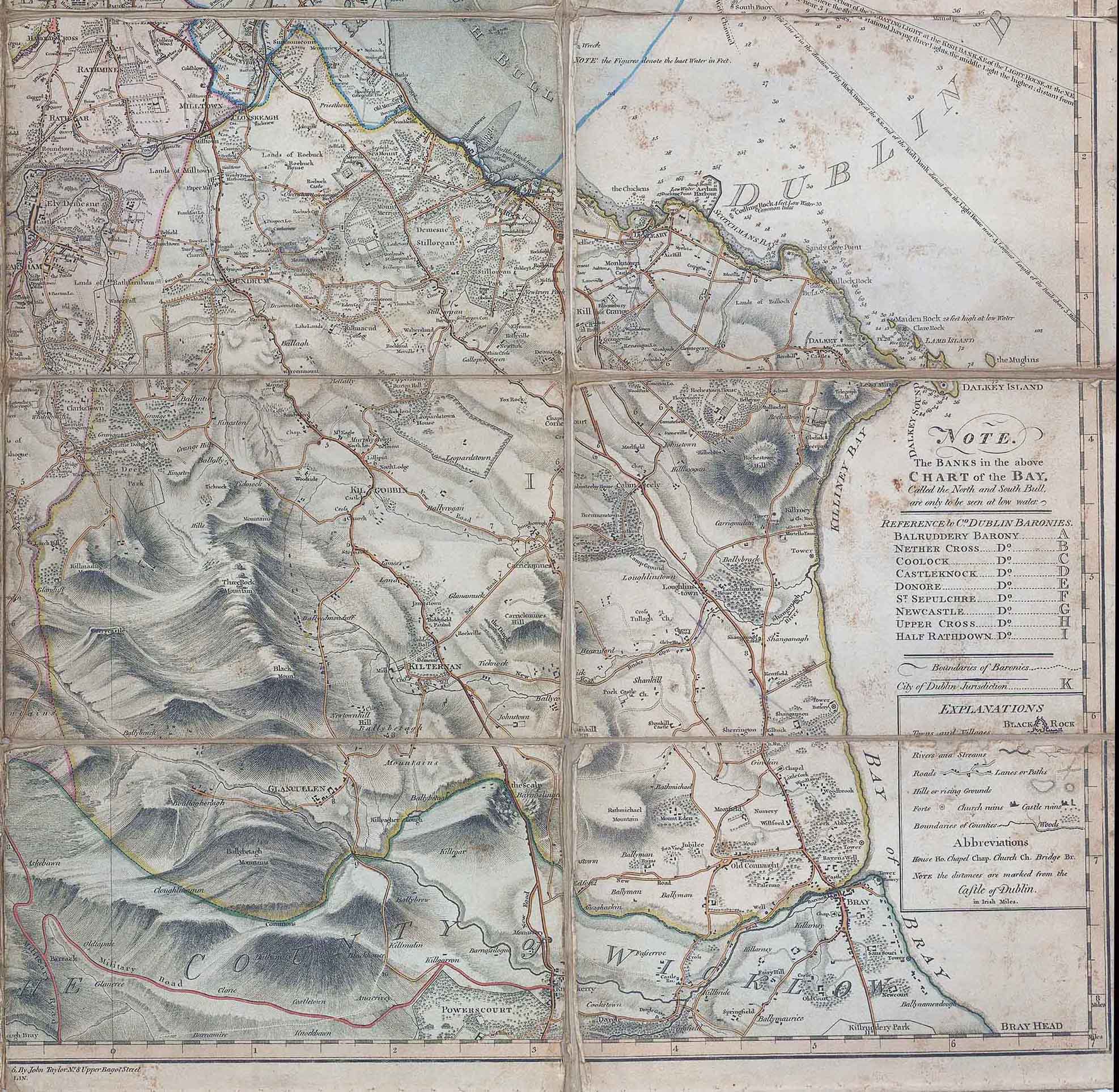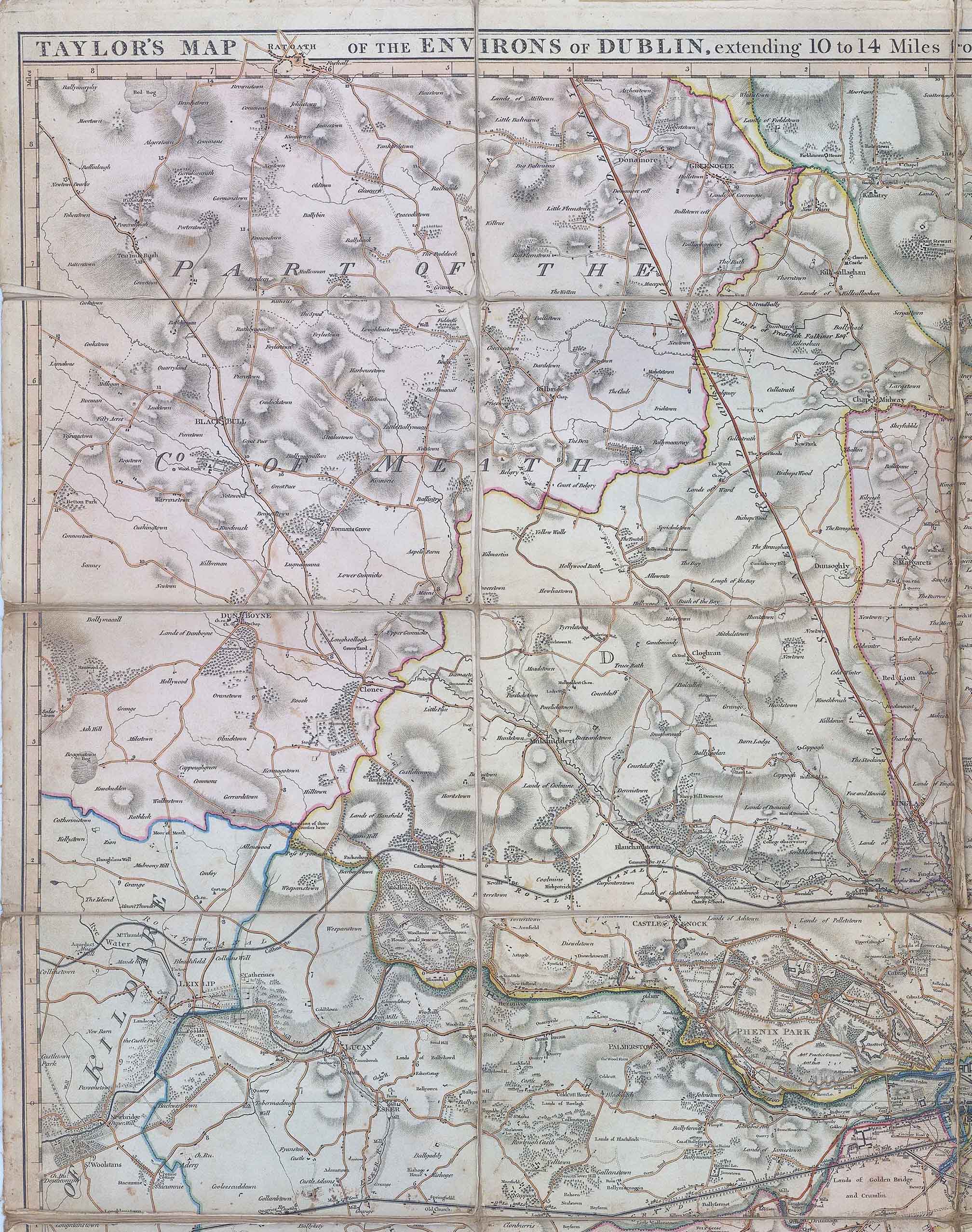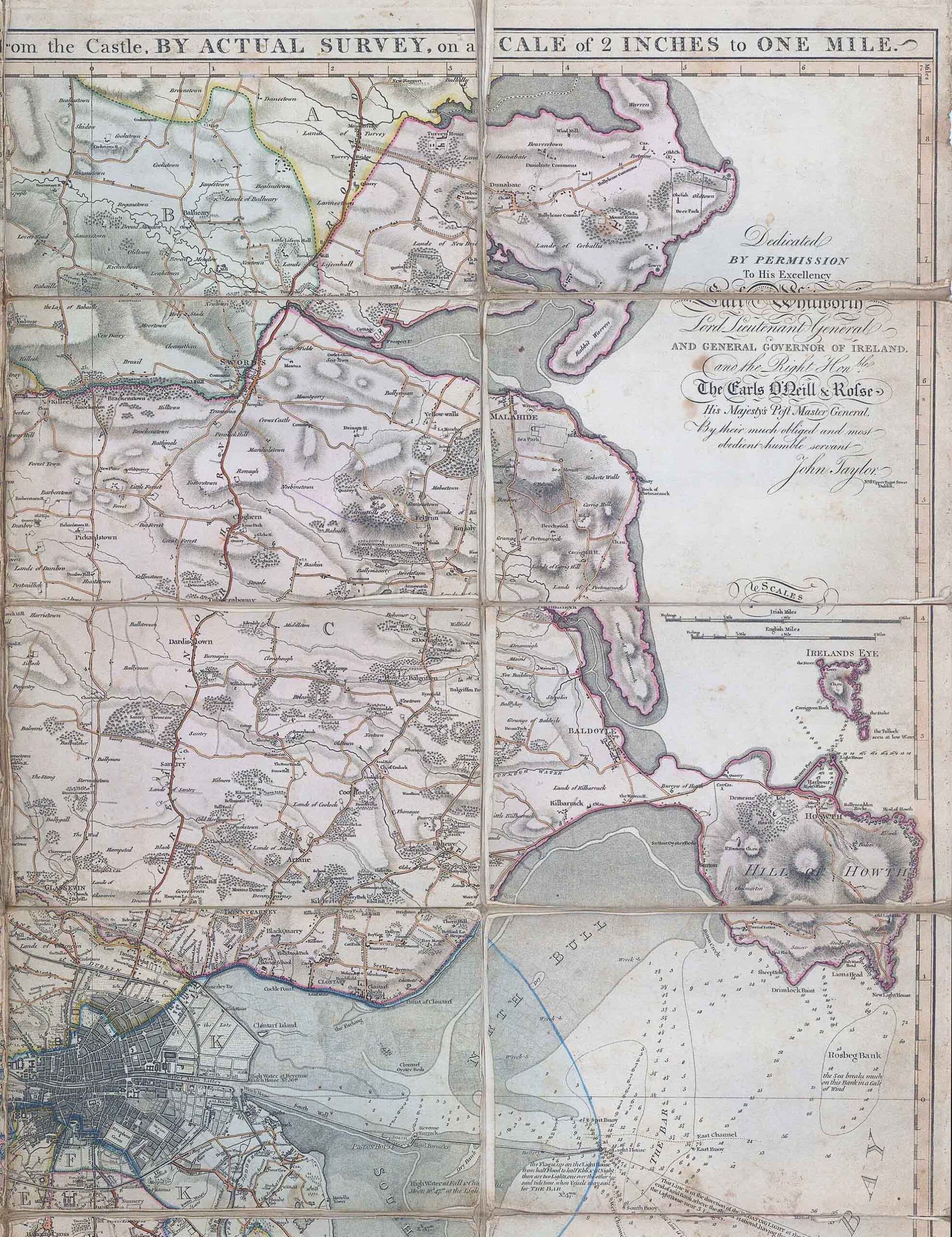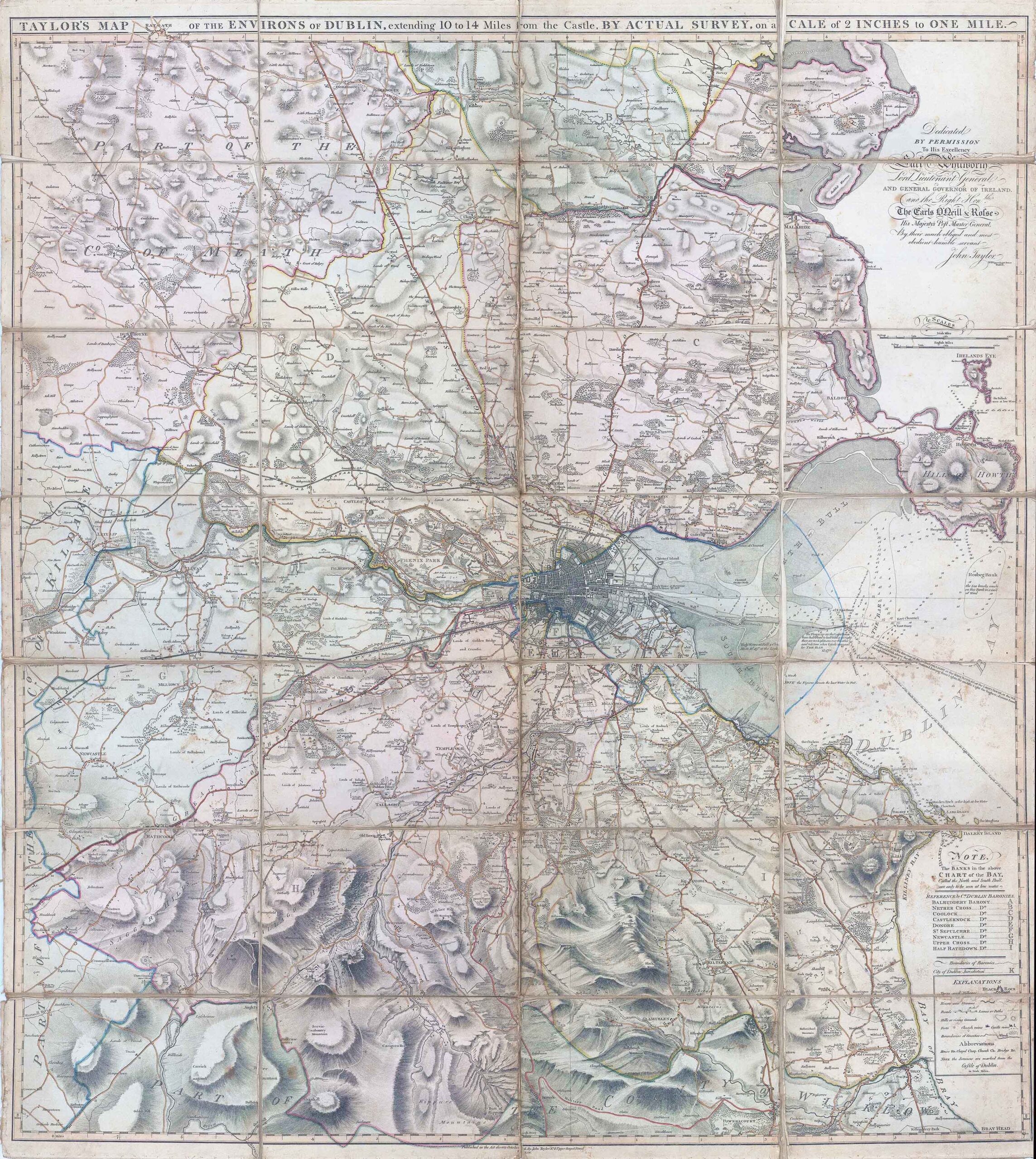 1816 - "TAYLOR'S MAP OF THE ENVIRONS OF DUBLIN extending 10 to 14 Miles from the Castle BY ACTUAL SURVEY on a SCALE of 2 INCHES to ONE MILE - Dedicated by permission to the excellency Earl Whitworth Lord Lieutenant General and General Governor of Ireland. and the right honble. the Earls O'Neill & Rolse his majesty's post master General, by their much obliged and most obedient humble servant John Taylor - No 81 Bagot Street Dublin".